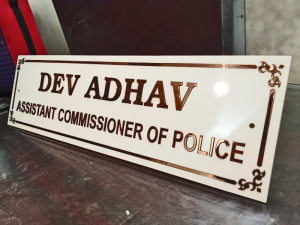Elegant acrylic name board with gold engraved text on a white base, giving a premium and professional look for office or cabin display.