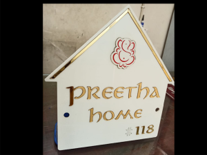 Charming home name board in a house-shaped design with a white acrylic base, golden text, and a Ganesha motif — symbolizing warmth, positivity, and divine blessings at your entrance.