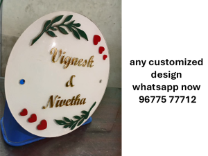 Beautiful couple name board crafted on a white acrylic base with golden letters, leaf accents, and heart motifs — a perfect decorative piece for home entrances or wedding gifts.