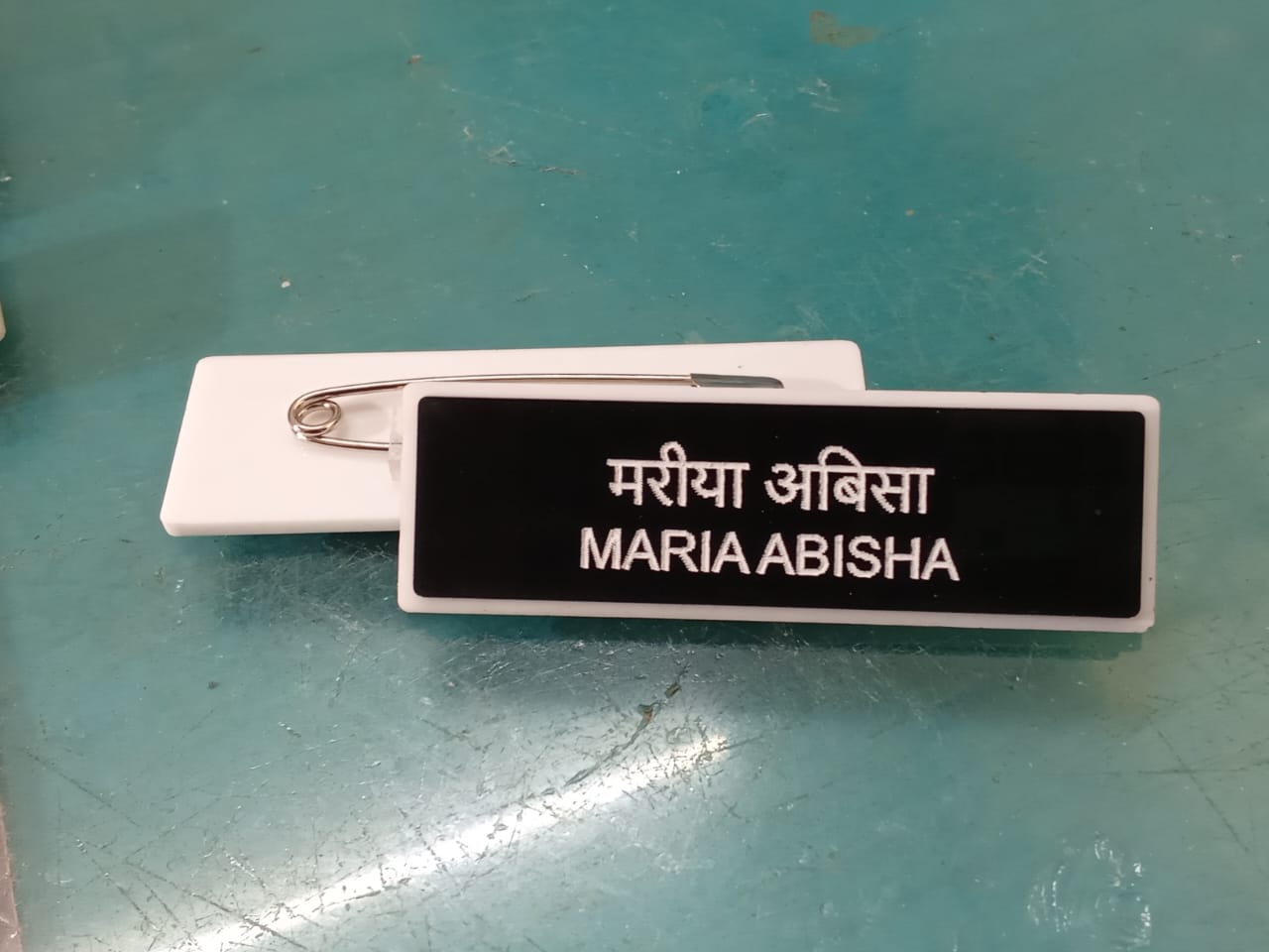 This is a customized white acrylic name badge designed with a sleek rectangular shape and smooth rounded corners. It features a black engraved plate with white lettering, giving it a professional and