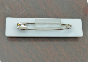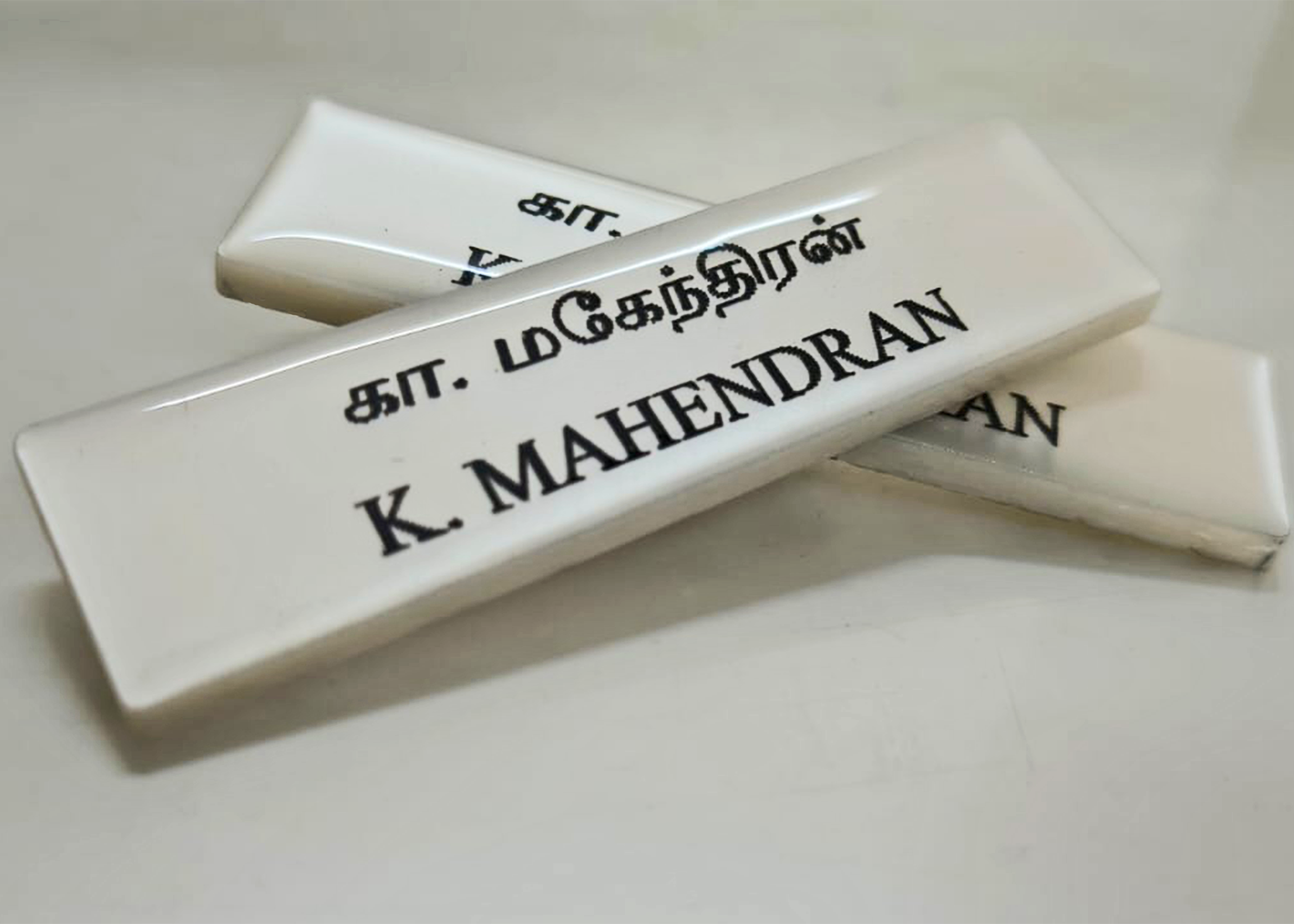 Premium white acrylic name badges with nylon lamination for a glossy, long-lasting finish. The laser-engraved text in Tamil and English provides a sharp, elegant look suitable for schools, offices, an