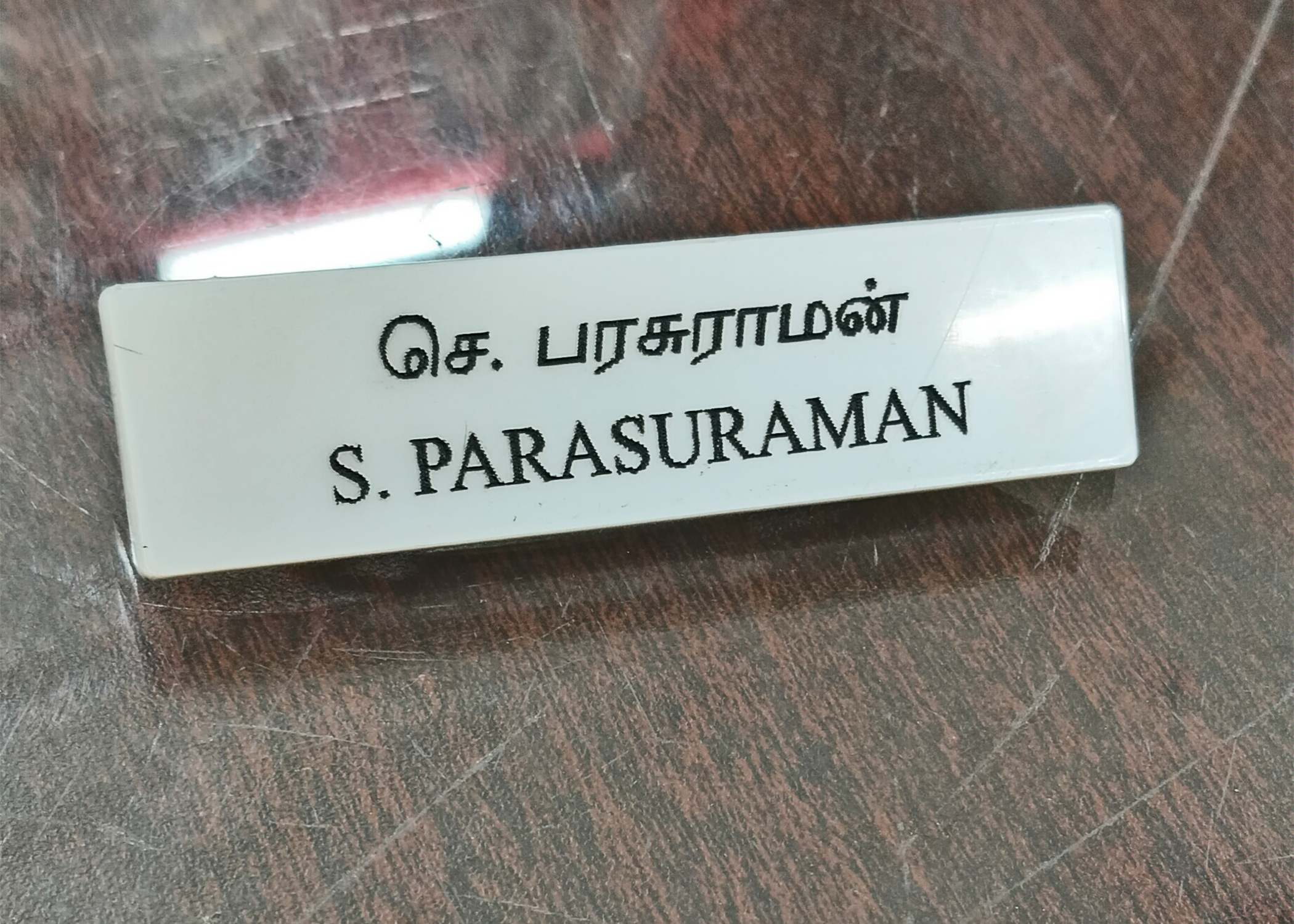 Elegant and durable white acrylic name badge with precise laser engraving in both Tamil and English. Perfect for office staff, schools, and corporate use. The smooth glossy finish gives a professional